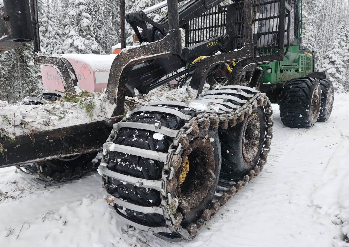 Гусеницы для форвардера РМБ64 являются самоочищающимися, в связи с чем отлично работают в глубоком снегу. Агрессивный, острый профиль трака придает гусеницам противоскольжения повышенное тяговое усилие и позволяет легко преодолевать крутые склоны.